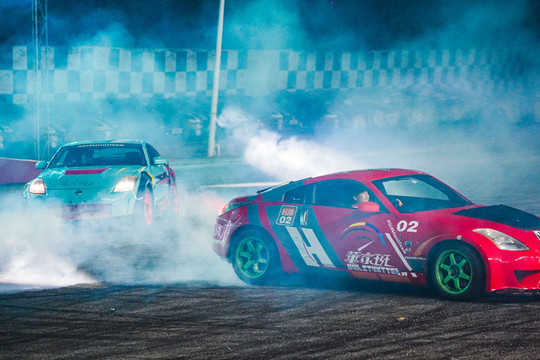 最后的环节是现实版的速度与激情,两台电影《速度与激情》里的尼桑350Z压轴登场,将现场气氛推上了高潮,轮胎摩擦产生的气体让整个表演场地都充满了烧焦的味道,超级爽的视觉观感体验。