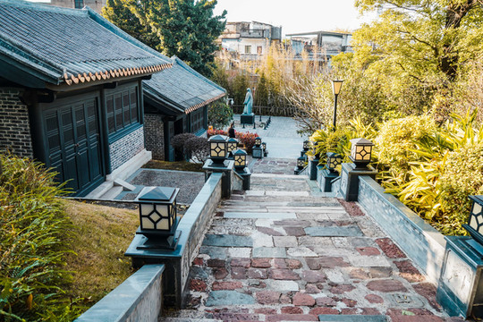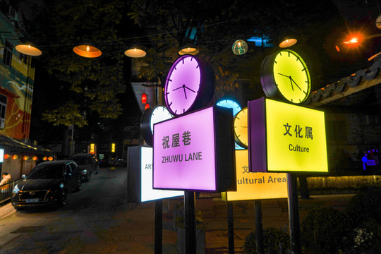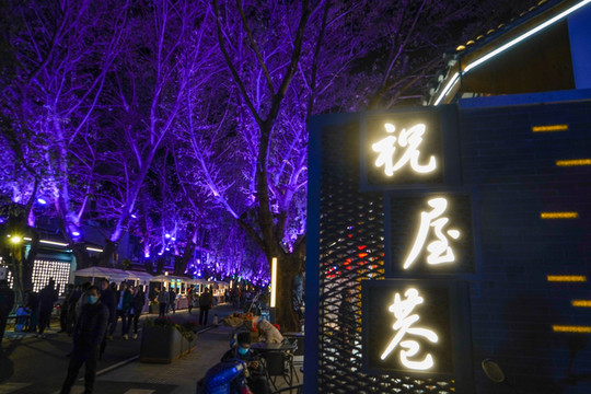 自带文艺气息的祝屋巷,道路两边的树木都点上了紫色的灯光。