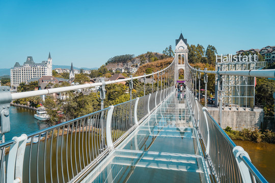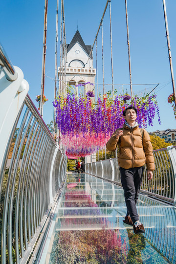 网红玻璃吊桥,上去前要穿上鞋套,其中有一段是液晶显示屏,走上去的时候,显示屏会模拟敲门裂开的效果,配上玻璃碎裂的音效,刹那间还真以为桥裂开了呢。