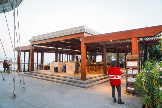 这个礁石酒吧就位于双月湾的一个楼盘内,名字叫园方东山海。到了以后要先去售楼部的营销中心,告诉他们去酒吧,然后按要求登记信息,领体验卷,乘坐观光车到达目的地。
