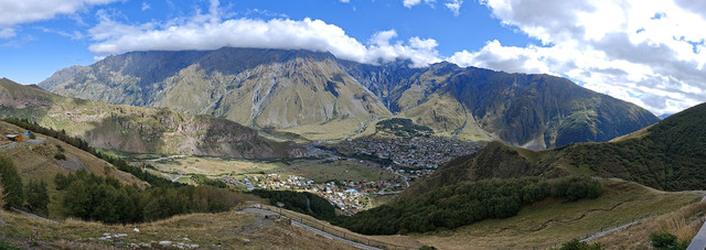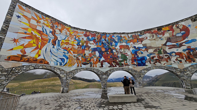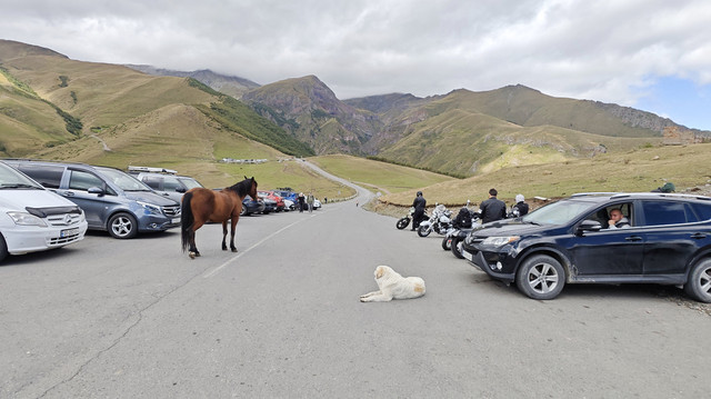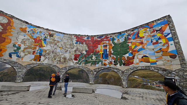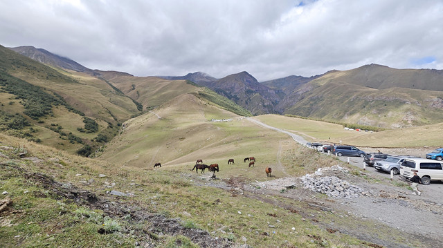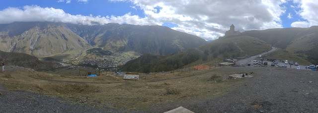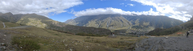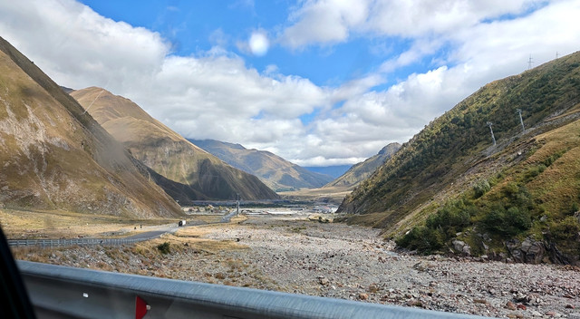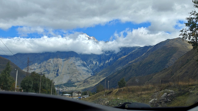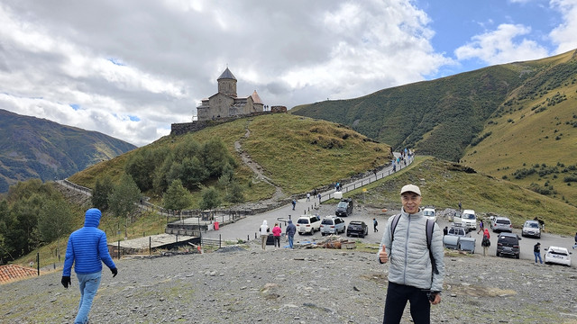 在自由广场附近,见有做旅游营运的车,与老板交谈去卡兹别克一日游,老板很健谈,包一天七八个景点,上卡兹别克教堂,时间可以按游客意愿自由调节,五座车350拉里,另外,考虑到今天卡兹别克还有阳光,明后天为阴天或雨天,所以决定今天去,谈成后,老板让司机先送我们回酒店拿点东西、带上御寒衣物(天气预报说卡兹别克最低气温7℃),八点半出发。