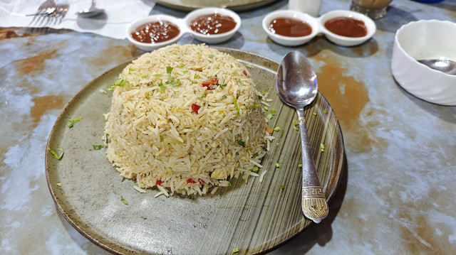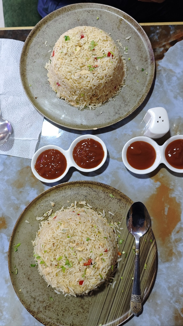 下山后去找吃的,一直回到俄格友谊纪念碑附近,找到这家印度风味餐馆,快下午两点了,点了鸡肉炒饭、蔬菜汤(味道不错,就是偏咸)、胡萝卜玉米汤(甜味)和MASALA茶,开动了。买单100拉里。