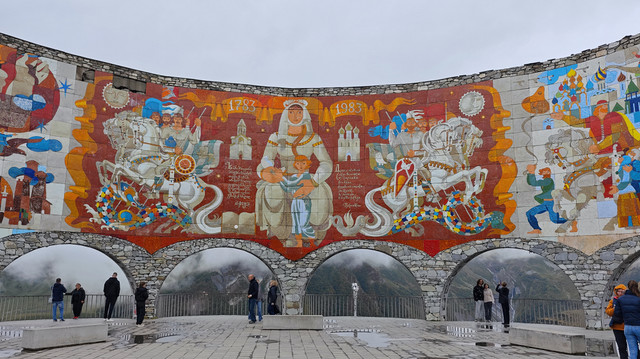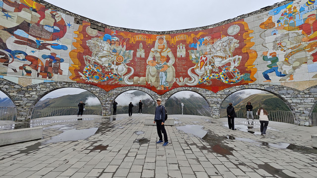 第三站,俄格友好纪念观景台。刚进场时,有个美女问司机需不需要玩些项目,司机对美女说你自己问问乘客吧,于是美女打开手机播出滑翔伞的视频,问我们要不要尝试,我笑着答复到,这项目适合年轻人,她自己也笑了。