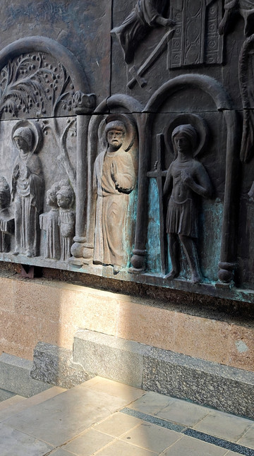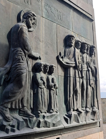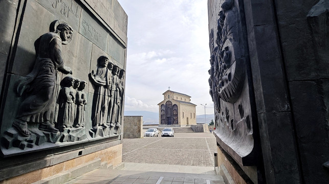 纪念碑纪念格鲁吉亚建国3000周年及基督教传入2000周年,浮雕涵盖圣经故事、历代君主及民族抵抗史。