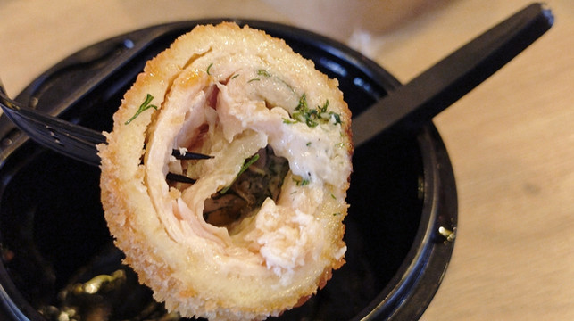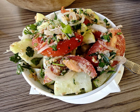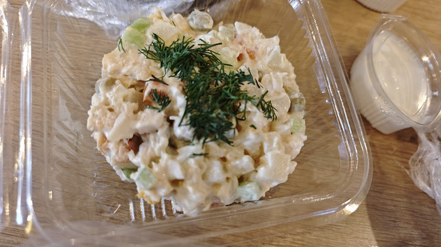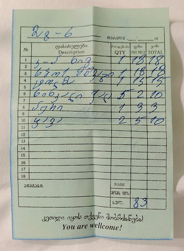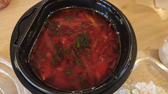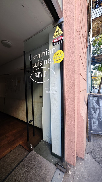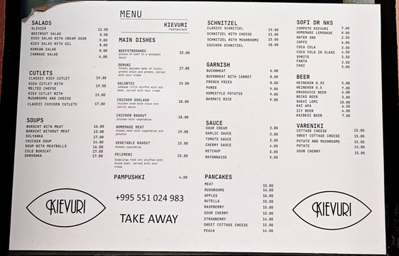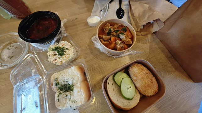 想问问营业时间,原来这是一家只做外送,不设堂食的店,于是我们下单点了四样(萨拉、传统基辅鸡肉包、罗宋汤、自制炖肉),三十分钟后回来取并现金结算即可,逛逛街,半小时后回来,支付66拉里后取回订餐,在酒店大堂慢慢享用,别有风味的晚餐体验。