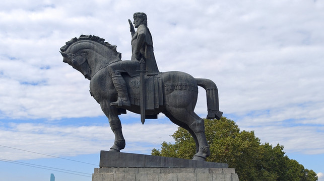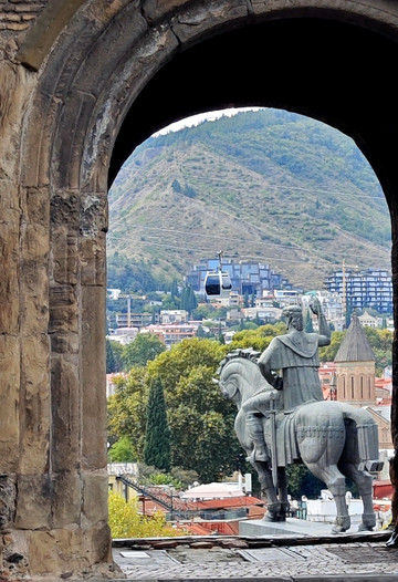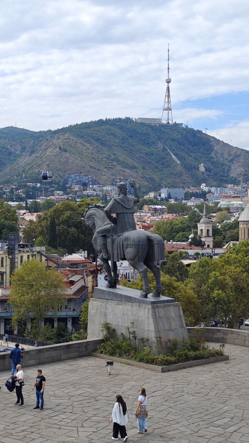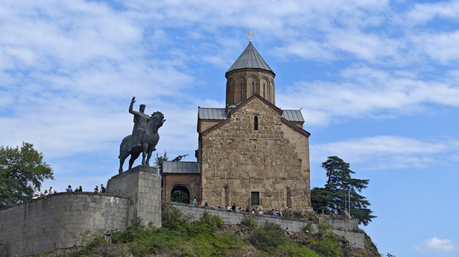 按导航走去 Metekhi Church of the Nativity of the Mother of God 教堂。教堂前的小广场有座雕塑,是格鲁吉亚国王瓦赫唐·戈尔加萨利雕像(Statue of King Vakhtang Gorgasali),位于第比利斯市库拉河畔,由雕塑家埃尔古贾·阿玛舒克利(Elguja Amashukeli)于1967年创作。