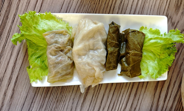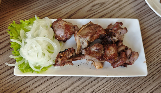 点了蔬菜沙拉(随菜送面包)、烤肉串、格鲁吉亚菜包肉、灌汤包和咖啡,83拉里。