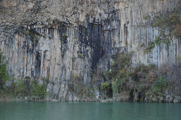 巨大的山崖围成了一个湖泊,石壁全是一条条石柱。有竖着的,有横着的,很奇特的火山地质现象。