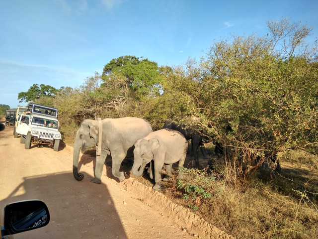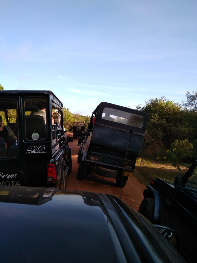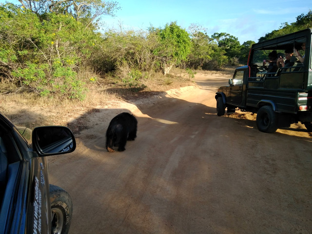 雅拉国家公园——这才叫野生动物园!那种一群人你挤我,我挤你,围着看一两只老虎打哈欠、睡大觉的地方叫啥。(当然,所有不算成本、不限定年龄段的比较都是随口一说。)看到了远处的花豹、近处的大象、孔雀、牛等等。然后还享受到一场所有车辆都在前前后后围追堵截两头熊的奇妙之旅。公园里的土路当中高、两边低,师傅要么加塞、要么往边上绕,车就是左边30°到右边30°,在笃定不会翻车的前提下非常爽快。