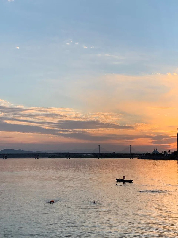 看橘黄色暖阳一点点沉浸在海中,暖色与蓝色的交织,组成一幅不一样的画卷。