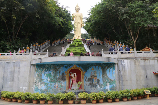 勐泐大佛寺建于古代傣王朝皇家寺院原址,依南莲山而建,落差达122.8米,有3000多级台阶。进入景区,首先搭电瓶车到山顶平台,举目望去,西双版纳尽收眼底。接着拾级而下,一路欣赏佛教建筑艺术至景区出口。