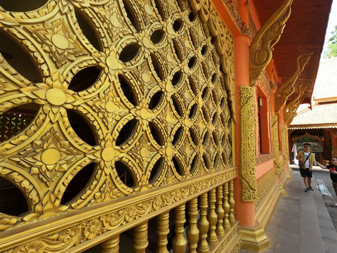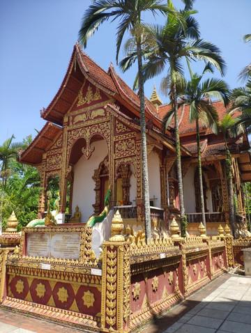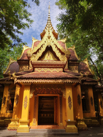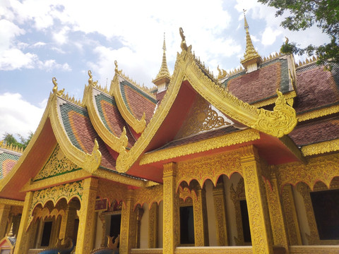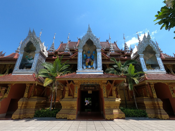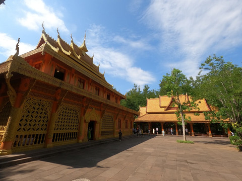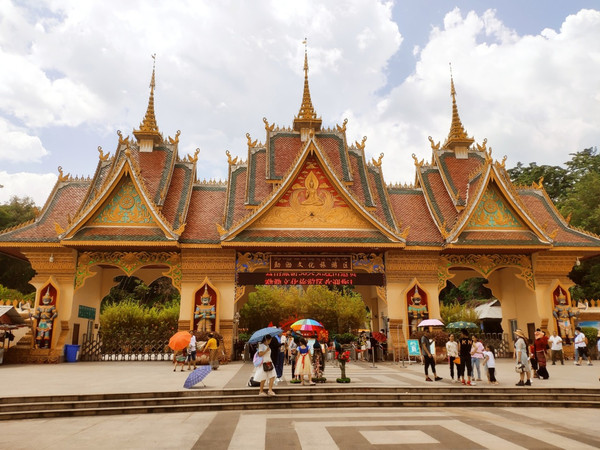 ①【大佛寺】大门就很吸引人,金碧辉煌的屋顶,是傣族庙宇的一大特色,连大门都如此,尤其是屋檐上那些金灿灿的装饰,好几层,让人过目不忘!
