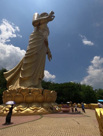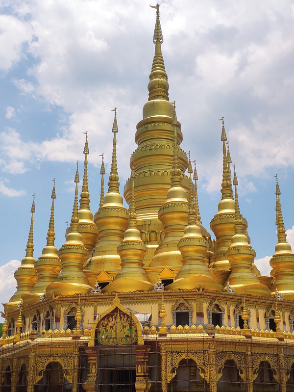 观景台后面,是在维修的大佛塔,在山脚远远能看到的就是大佛像和这座佛塔了。金碧辉煌,莲花状散开,大大小小的佛塔簇拥一起,壮观。可惜没法进去,只能旁边远远看着。