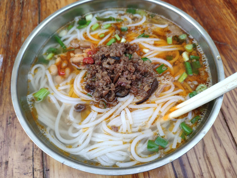 米粉入口瞬间,印象180度转弯,真太好吃了,幸福感爆棚!米粉比 江西 米粉略细,口感更加细嫩。这里盛产大米,米粉自然也是主食之一。汤汁有肉丝蘑菇和黄豆酱加持,香。