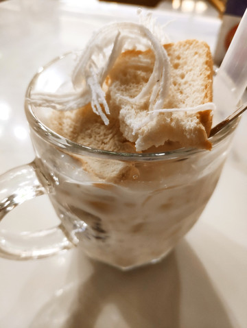 泡鲁达先上,冰椰汁泡跑着干面包片,跟豆浆泡油条异曲同工啊!在这热带地区的炎炎夏日,吹冷气喝冷饮,超惬意!
