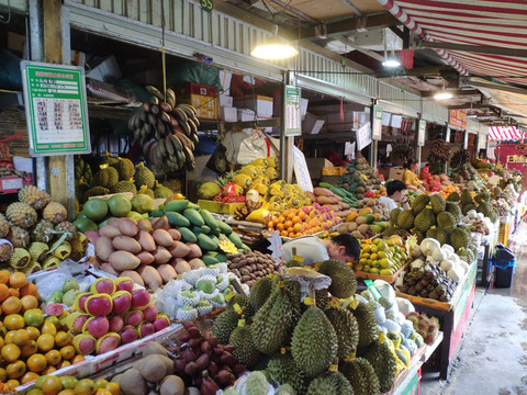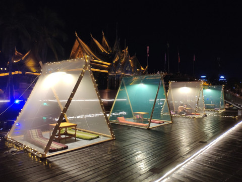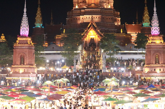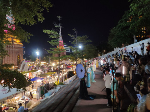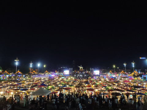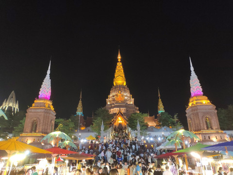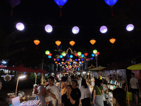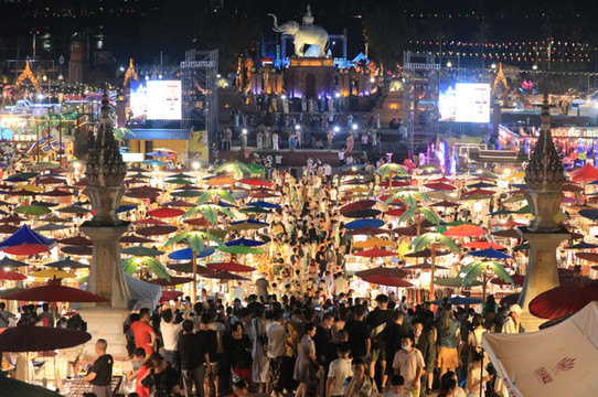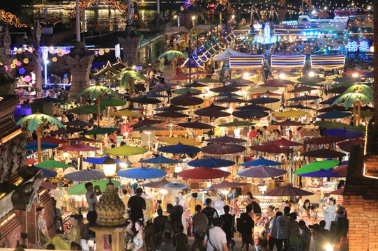 整个夜市,可以划分为三大区域,一个是大金塔景区外的街道夜市,这里有很多店铺商家,也有摆摊的小贩,都很热闹。另外两个是在大金塔景区里,一个是大金塔和下面的大广场,每个摊位都用不同颜色的大伞遮阳,特别好看,夜晚灯火璀璨;另一个便是六国水上市场,围绕这一片水域,又一番灯光修饰,加上远处大楼霓虹闪烁,整个夜市更加灿若星河。