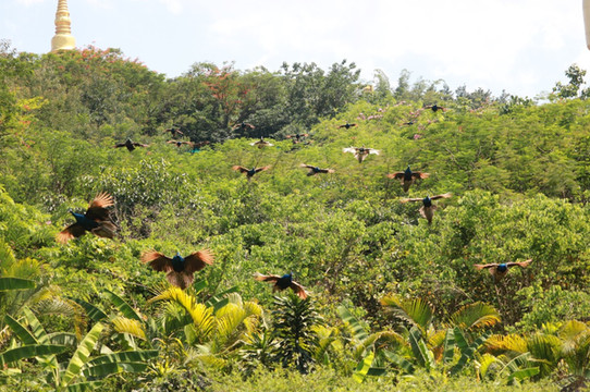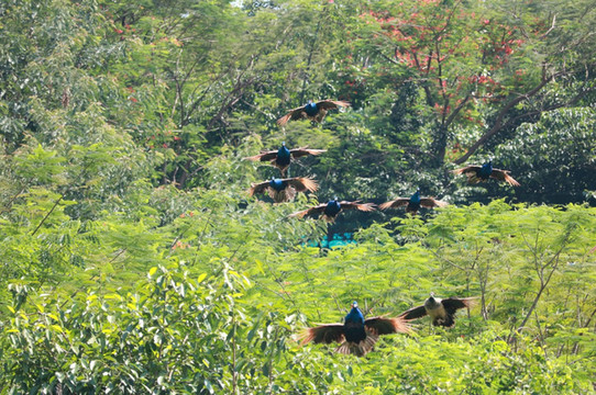2点45,众人开始围拢到空地。3点准时,孔雀从半山腰飞下来进食,前后五六分钟,孔雀陆陆续续、三五成群,从半空飞(滑翔)下来进食,真壮观。这么多大鸟,一下子几百只下来,让人大开眼界。运动相机拍了整个过程,单反抓拍了好多细节,完美配合。大鸟从空中张开双翅滑翔下来,落地前再扑棱几下翅膀以作缓冲。羽毛颜色鲜亮,就跟一个个空中舞者下到舞台一样好看。