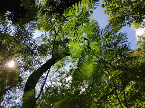 羽状叶,很像含羞草那种类型的叶子,和红花楹、蓝花楹差不多。但其实里面有很多区别,没法细究了。附近还有海红豆,羽状叶的叶子比较大片一些。都叫豆啊,天哪,这么大的树,因为果实种子是豆,就都叫豆,哈哈。