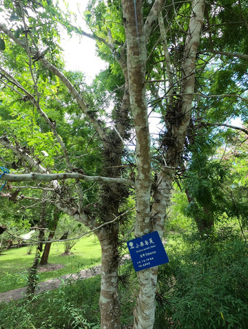 这里还有腊肠树,很奇怪,果实是长长的条状物,跟腊肠似的。这里还看到另外一种豆类大植物粘叶豆,跟爪哇球豆花很像。