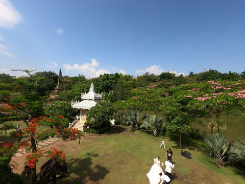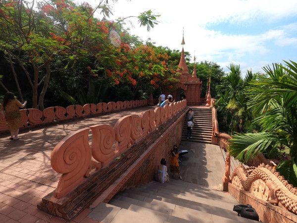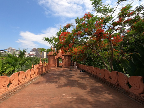 最让人印象深刻的还是前面这个御象咖啡厅。建筑是喀斯特地貌的那种红,漂亮、浑厚。有几株凤凰木,花开正艳。旁边还有一座白塔。