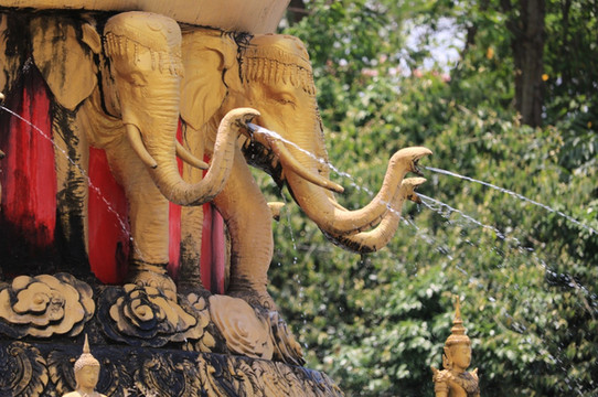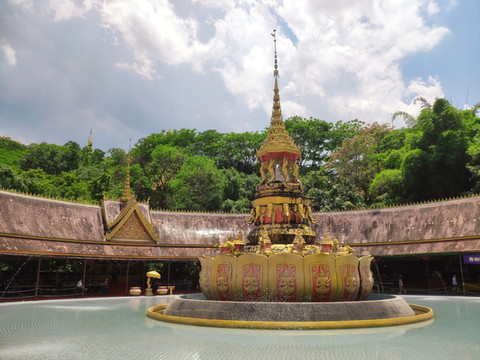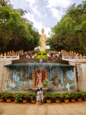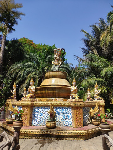 旁边则是大地女神的雕塑,传说她拔了一根头发,头发出大水,冲走了威胁释迦摩尼的妖魔鬼怪,于是这个雕塑就跟水有关,底座有很多龙头,吐水,下有金盆接着,好多小姐姐就在这里拍双手捧水的照片。