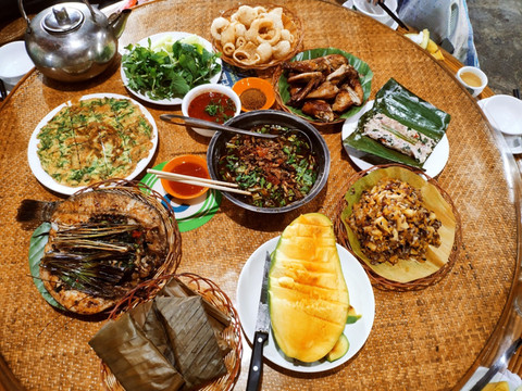 出水果中心,到 西双版纳 旅游度假区吃傣家乐,实惠。一份傣家乐套餐150元左右,满满一桌,有香茅草烤罗非鱼、菠萝饭、臭菜煎蛋、炸猪皮、粉丝、烤鸡等,颜值真高。菜的种类丰富,但硬菜还是比较少,不像 东北 ,道道上来都让人惊呼硬菜。这顿傣家乐,整体更加养眼,至于实际的饱食程度嘛,见仁见智了。司机小哥跟我们说,傣族,男孩子姓岩的比较多,女孩子的姓玉的比较多,怪不得看到很多农家乐的名字都带有岩或玉。