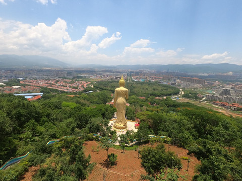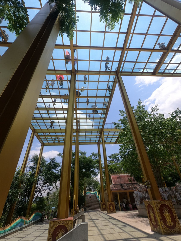 大佛身后,是一个玻璃观景台。这里能俯瞰整个 景洪 市,视野开阔。观景台下面有菩提树,据说是佛祖顿悟时那棵菩提树的直系后代。旁边还有一个眼镜蛇形象的龙。进玻璃观景台,需买一次性鞋套,一双5元。