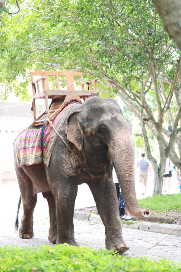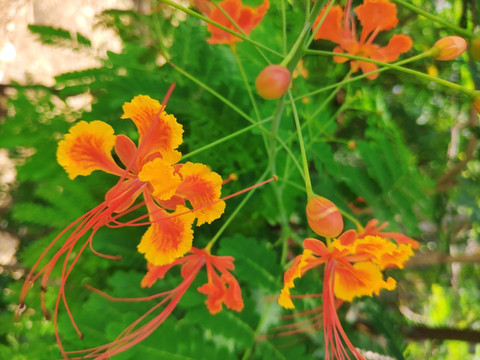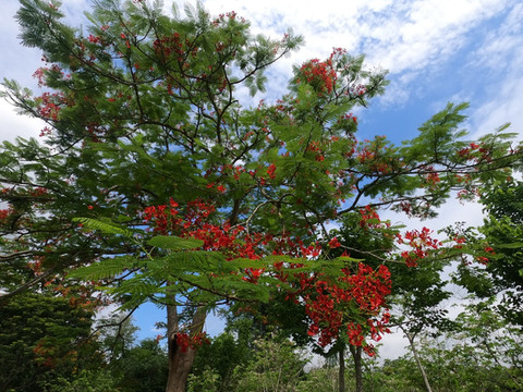 在旁边阴凉处休息,泼水活动是2点多,放飞孔雀是3点,不急。旁边有几株凤凰花,花开正艳。凤凰花是 汕头 市花,在版纳也随处可见,绿色羽状叶配火焰般耀眼的红花,让人喜爱。反观 汕头 的金凤树,好像不常见了。不过也正因为是 汕头 市花的缘故,才让我对凤凰木有了最初的认识。