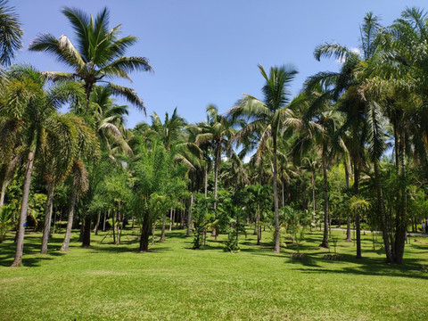 园区宽阔,棕榈类植物特别多种,大小高低错落,让人眼花缭乱,很多小姐姐都在美美地拍照。椰子、槟榔、棕榈等等,还有能源植物那里的糖棕、油棕、砂糖椰子等,都是棕榈。有的树上结满红彤彤的果子,让人垂涎。这些棕榈植物散布在一大片草地上,满园绿意,让人心情舒畅。