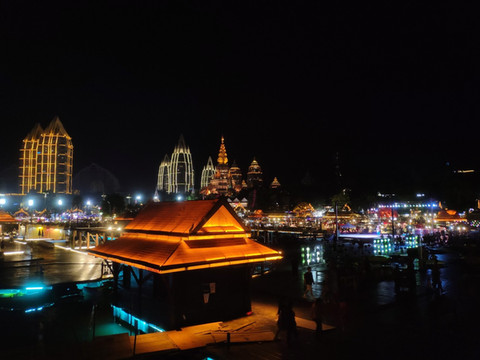 在水边,拍了六国水上市场几个大字作为背景的照片,这夜市,灯火辉煌,游人如织,绝对是版纳必来的景点了。