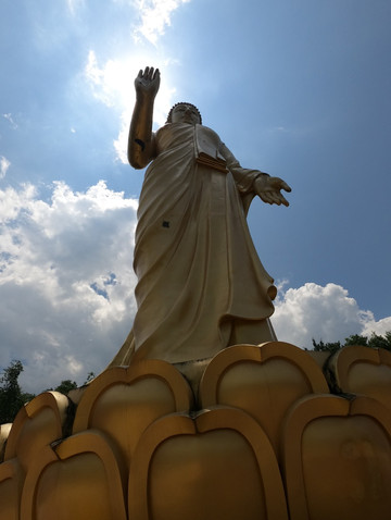 沿台阶上去,终于到大佛下面,佛像非常高大!45米高,须仰望。站在大佛脚下,拍不到大佛全身,只能蹲下仰拍。佛教真的也是一种神奇的存在了,这么个精神信仰,凝聚了多少人心,促成大家一起建造这么大的佛像,精神力量化成的实际执行力真是让人震撼。