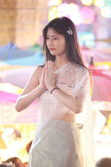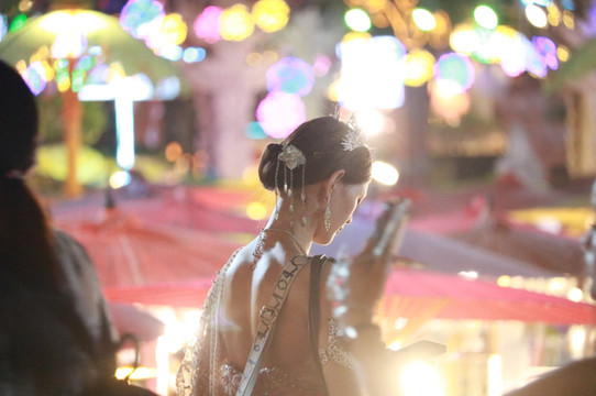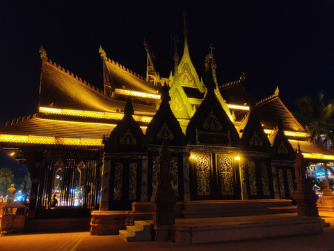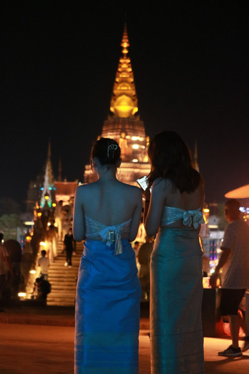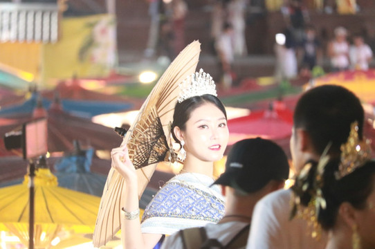 游客非常多,摩肩接踵。有好多摊位,热闹,卖小吃的、饰品的应有尽有,还有广场卖唱的,还有酒吧表演节目的。这里有好多小姐姐、大姐姐穿傣服拍照,会摄影在这里绝对是非常吃香的。穿上傣族特色服饰,在夜市和大金塔等标志性景点拍一套美美的傣妹装,应该是很多小姐姐来版纳的必做事之一了。第二天去曼听公园,也是随处可见小姐姐们穿傣族装拍照。
