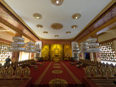往上,是大殿,略宏伟。屋顶也是分好几层叠加,这个建筑风格跟国内的大雄宝殿还是有区别,国内是一层楼一层屋檐,这边是一层好几个屋檐的感觉。进到店内,所有柱子和墙面都上金漆,亮闪闪的太豪气了。大殿中央同样有个大平台,上去祭拜得拖鞋。大殿屋顶很高,殿内特别凉。