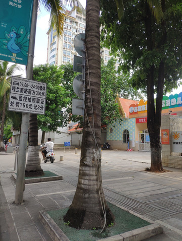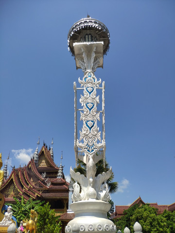 骑行大概半小时能到勐泐大佛寺,沿路真热,这是我看过的第一个有在绿化树上加水汽喷头的城市。当时就奇怪,怎么感觉有些路段有水汽迎面而来,原来是加装在绿化树上的喷水装置。 西双版纳 热得需要喷水汽降温,而 吐鲁番 是干热到需要在绿化树下引水管滴灌,都不容易啊,这些气候迥异略的地区。