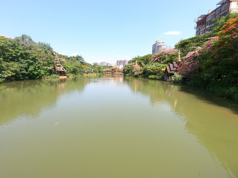 往前是游船码头、八角廊桥。那里有个御荷园,荷花蛮多, 非洲 鲫鱼更多,这是当地特色菜香茅草烤鱼的主要食材呢。一条普通的罗非鱼,成本价10块钱不到,能做成几十块钱的菜,利润不低!湖泊旁有一种树,和凤凰木很像,但叶子更大,花是粉红色的。湖泊旁有滨水长廊休息区,游客投食,天鹅和罗非鱼争相抢夺。