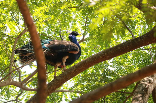 第一个是在树顶,难得啊,以前看到的孔雀都是在平地小范围内踱步,压根就不敢想象它还能飞上树顶,都快忘了孔雀其实是一种会飞的大鸟了。