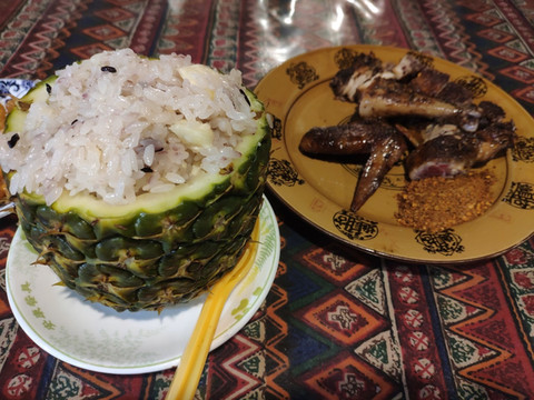 傣族特色菜回青旅休整,再前往告庄星光夜市,到简朴寨吃烤鸡和菠萝饭。