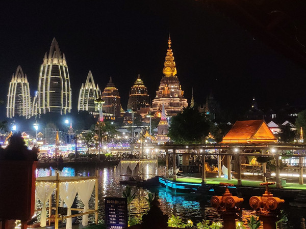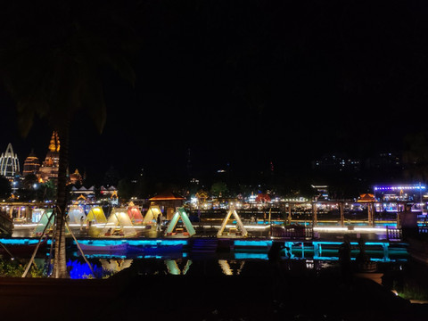 水上市场,可坐船水上夜游。水域周边,则是各种入夜模式的开枝散叶,有搭设霓虹纱帐卡座的,有各种小摊位卖果汁卖烤肉卖饰品的,也有舞台上唱歌的,两三个歌手轮流唱傣族味道的歌曲(听着像 泰国 歌曲),台下观众欢呼雀跃,真是热闹的夜。