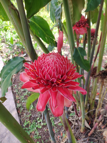 池子有荷花,恰逢花开正盛,尤喜那种大朵的粉红色荷花!此外,周边还种植了各种蝎尾蕉类的植物,不同颜色、造型相似错落有序的花絮,好漂亮,最让人震惊的是一大朵比玫瑰还妖艳的粉色花朵,叫瓷玫瑰,是火炬姜的花!