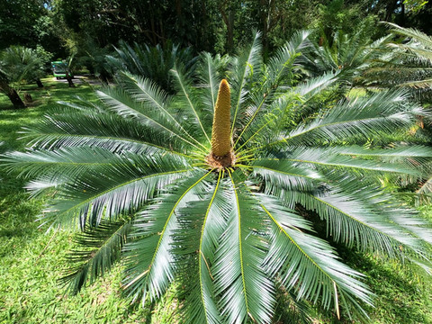 苏铁也俗称铁树,铁树开花说的就是这种!这片苏铁园,面积不大,但苏铁种类蛮多,高矮粗细都有。苏铁的叶子细长而坚硬,刺到特别痛。叶子都是绿色的,生机盎然,有不少苏铁正中央有长出花球一样的东西,这应该就是铁树开花了吧。
