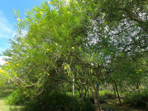 继续往前,有檀香树,特别不起眼,没想到这么受世人欢迎,价值真高。树心可做药材,主干和根可提炼檀香精油,还是香料原材料,雕刻工艺品的上好原材料。全身是宝啊。