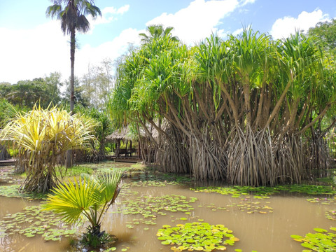 露兜树另一侧,连着水池,有各种颜色的小荷花,特别好看。白的、紫的、红的、粉的,莲花盛宴啊。棕榈园旁紧挨着水生植物园,可惜季节不对,没见到超级大的王莲荷叶,没机会尝试站在荷叶上的感觉。