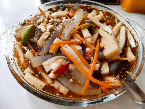 柠檬米粉很快也上来了,一大盘。看到出品,有点懵,原来是 西安 凉皮那种质感的小长方体米粉啊,我以为是跟 江西 米粉那种一样的细条长圆柱状呢,哈哈。夏季吃酸辣口味的冰米粉也真是第一次体验,很棒,冰凉酸辣,感觉还能解暑的样子,于是呼啦吃了好多口,但过会就感觉不对劲,辣得头皮发麻,这个辣度丝毫不输川渝啊,我的天!可怜那杯泡鲁达,被当成止辣的冰镇饮料。米粉,吃不到一半就放弃了!太辣了!
