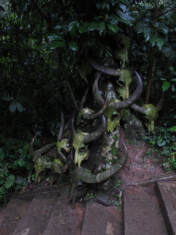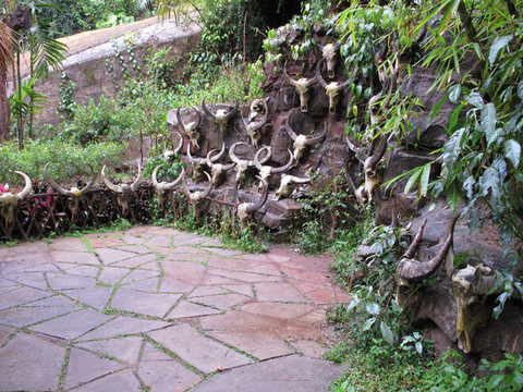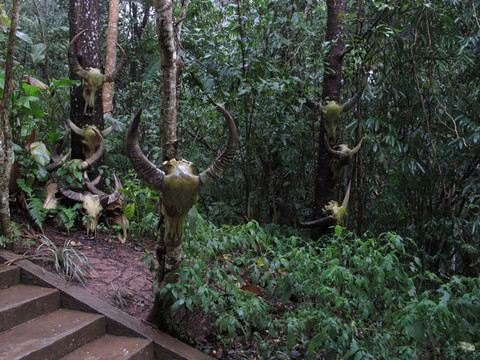 进入山寨,首先映入我们眼帘的是散布在路边和树上的牛头骨盖。据导游男孩介绍,基诺族男孩到18岁时,必须亲手杀死一头牛,才算成年,牛头就挂在树上或放在路边。我们问导游:你18岁时杀了牛没有?害怕否?导游回答:当时非常地害怕,但是没有退路,只能硬着头皮上。由于他个子小,力气也小,捅了两刀,才捅到牛的致命处。虽然他表示当时他很蔫,但我们一致认为他很勇敢,毕竟是一头成年的牛啊。想想我们18岁时,有没有勇气拿把刀对着牛刺去呢。