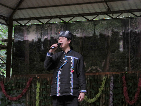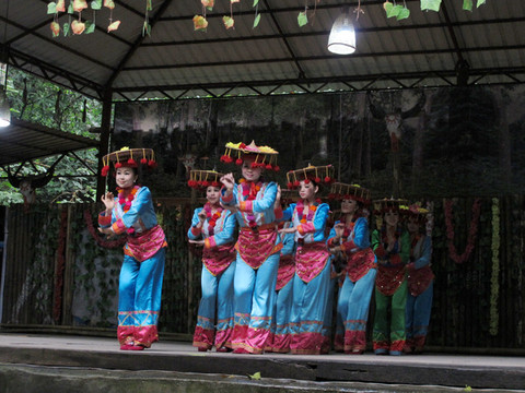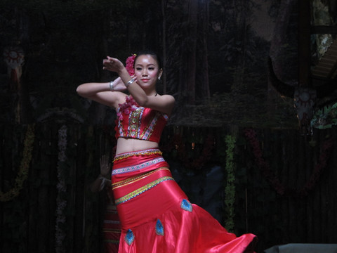 最后到达一个简易舞台,观看克木人的歌舞表演。舞台上的小伙和姑娘们估计是山下请来的,因为她们与我们刚才手拉手跳舞的姑娘不是一个类型的。