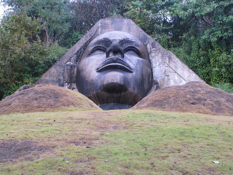 顺着台阶往山上走,在一男一女雕像前,导游介绍说这是他们的祖先,男的叫玛黑,女的叫玛妞,玛黑和玛妞是亲兄妹。由于洪水,玛妞和玛黑的母亲将他们俩放在一个大鼓内才辛免于难。为了不让他们的民族消亡,玛妞和玛黑决定繁衍后代。因为是近亲,所以他们的后代脑子都不好使。为了优生优育,现在允许与外族通婚。