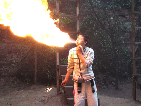 看完表演和拍卖,就下山了。问导游克木人真正的居住地在何方,回答最近的要走8里山路。在下山的途中有一处克木人表演赤脚在碎玻璃上行走和用刀砍自己的脚等。