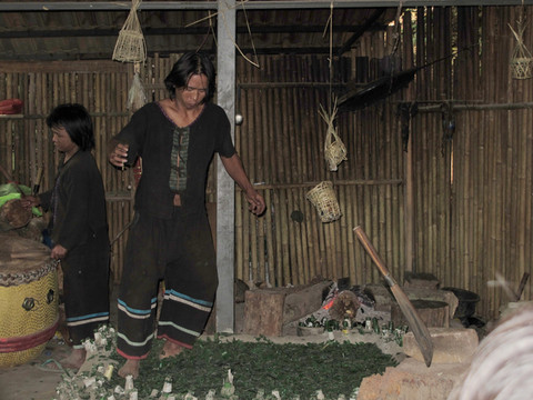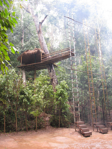 我们沿着上山的小路走不远,就见一克木人在我们头顶上呼啸而过,从一棵树荡到另一棵树。显示克木人有居住在树上的习性,采摘果子、猎捕动物的技能。