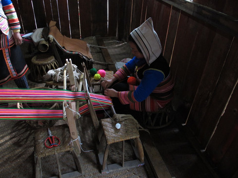 在劳作间,几位妇女正在织鲜艳的土布。还有一些后代们围着火盆嗑瓜子聊天,展示他们休闲的生活状况。