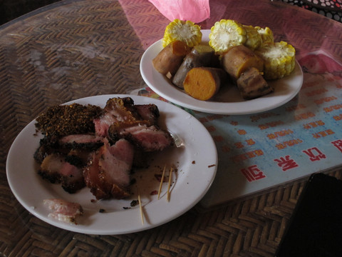 走出“卓巴房”,有一场基诺族青年民族歌舞的表演,同时免费品尝烤猪肉和甜玉米。在一广场上,基诺族青年唱歌、跳舞,最后与有客互动把演出推向高潮,同时基诺山寨游览也接近尾声了。